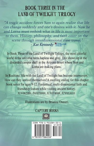 Book Three of the Land of Twilight Trilogy. How can the most colorful world in the universe turn hapless and gray?! That's what mystifies Sam and Lorna. Falling from the Land of Twilight, Trix shows up at the discarded camper shell in the Arizona desert where Sam and Lorna are making plans. Trix and Melvin begin weaving their own lives into the Land of Realtime repaying Lorna and Sam for interweaving theirs with the Land of Twilight. How can the four friends unravel themselves? Then, things take a bad turn. A tragic accident forces Sam to again realize that life can change suddenly. Now he and Lorna must rethink what in life is most important to them. History, philosophy, and faith enter the scene through interdimensional time travel. The Land of Twilight Trilogy is filled with adventure and supernatural elements for readers. With its relatable characters and fast-moving plot, themes such as a child building a relationship with an estranged parent and how strangers who offer truth can help Sam and Lorna discover their priorities. As Sam faces unbearable consequences, he learns the bonds of true friendship and personal truth are real. Readers are given not only an interesting story filled with allegorical elements but are challenged to think about their own ideas of reality and meaning. A swelling ending for this chapter book series for.ages 9-12. Fantastical, multi-dimensional faith and friendship feature while visiting ancient history. Lorna and Sam visit philosophers in their quest in metaphysical spell-binding, time-travel where wonders of adventure await.