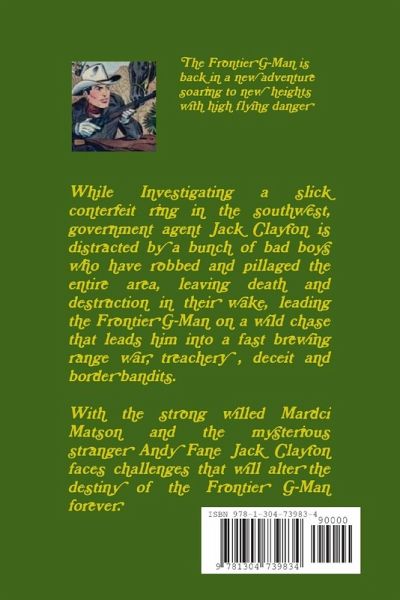 The Frontier G-Man is back in a new adventure soaring to new heights with high flying danger. This time government agent Jack Clayton is investigating a slick counterfeit ring in the southwest. He is distracted by a gang of bad boys who have robbed and pillaged the entire area, leaving death and destruction in their wake. A wild chase leads the Frontier G-Man into a fast brewing range war, treachery, deceit and border bandits.