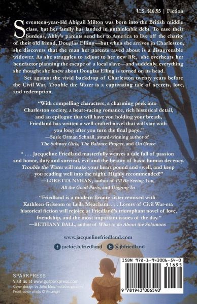 Abigail Milton was born into the British middle class, but her family has landed in unthinkable debt. To ease their burdens, Abby’s parents send her to America to live off the charity of their old friend, Douglas Elling. When she arrives in Charleston at the age of seventeen, Abigail discovers that the man her parents raved about is a disagreeable widower who wants little to do with her. To her relief, he relegates her care to a governess, leaving her to settle into his enormous estate with little interference. But just as she begins to grow comfortable in her new life, she overhears her benefactor planning the escape of a local slave—and suddenly, everything she thought she knew about Douglas Elling is turned on its head. Abby’s attempts to learn more about Douglas and his involvement in abolition initiate a circuitous dance of secrets and trust. As Abby and Douglas each attempt to manage their complicated interior lives, readers can’t help but hope that their meandering will lead them straight to each other. Set against the vivid backdrop of Charleston twenty years before the Civil War, Trouble the Water is a captivating tale replete with authentic details about Charleston’s aristocratic planter class, American slavery, and the Underground Railroad.