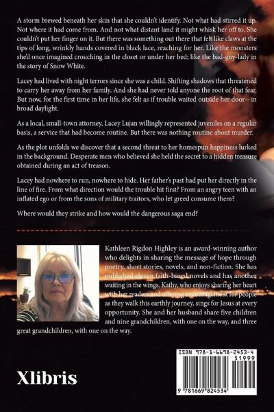 A storm brewed beneath her skin that she couldn't identify. Not what had stirred it up. Not where it had come from. And not what distant land it might whisk her off to. She couldn't put her finger on it. But there was something out there that felt like claws at the tips of long, wrinkly hands covered in black lace, reaching for her. Like the monsters she'd once imagined crouching in the closet or under her bed; like the bad-guy-lady in the story of Snow White. Lacey had lived with night terrors since she was a child. Shifting shadows that threatened to carry her away from her family. And she had never told anyone the root of that fear. But now, for the first time in her life, she felt as if trouble waited outside her door-in broad daylight. As a local, small-town attorney, Lacey Lujan willingly represented juveniles on a regular basis, a service that had become routine. But there was nothing routine about murder. As the plot unfolds we discover that a second threat to her homespun happiness lurked in the background. Desperate men who believed she held the secret to a hidden treasure obtained during an act of treason. Lacey had nowhere to run, nowhere to hide. Her father's past had put her directly in the line of fire. From what direction would the trouble hit first? From an angry teen with an inflated ego or from the sons of military traitors, who let greed consume them? Where would they strike and how would the dangerous saga end?