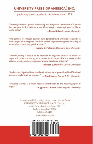 Troubled Journey: Nigeria Since the Civil War probes into Nigeria's unique experience as modern African state. It pulls together a talented group of Nigerian historians writing on Nigeria since Independence Day on October 1, 1960, through the devastating Civil War of 1967-1970 into present day. This book is a major contribution to the on-going debate about how the country can best be politically restructured and socio-economically reformed.
