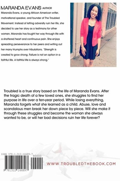 Troubled is a true story based on the life of Maranda Evans. After the tragic death of a few loved ones, she struggles to find her purpose in life over a ten-year period. While losing everything, Maranda forgets what she learned as a child. Abuse, love and scandalous men break her down piece by piece. Will she make it through these struggles and become the woman she always wanted to be, or will her bad decisions ruin her life forever?