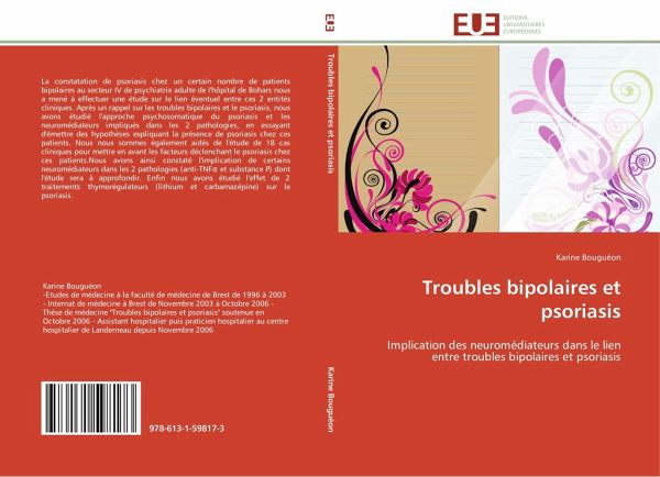 La constatation de psoriasis chez un certain nombre de patients bipolaires au secteur IV de psychiatrie adulte de l'hôpital de Bohars nous a mené à effectuer une étude sur le lien éventuel entre ces 2 entités cliniques. Après un rappel sur les troubles bipolaires et le psoriasis, nous avons étudié l'approche psychosomatique du psoriasis et les neuromédiateurs impliqués dans les 2 pathologies, en essayant d'émettre des hypothèses expliquant la présence de psoriasis chez ces patients. Nous nous sommes également aidés de l'étude de 18 cas cliniques pour mettre en avant les facteurs déclenchant le psoriasis chez ces patients.Nous avons ainsi constaté l'implication de certains neuromédiateurs dans les 2 pathologies (anti-TNF et substance P) dont l'étude sera à approfondir. Enfin nous avons étudié l'effet de 2 traitements thymorégulateurs (lithium et carbamazépine) sur le psoriasis.