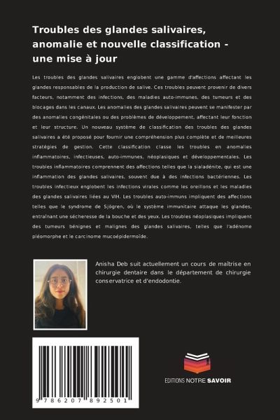 Les troubles des glandes salivaires englobent une gamme d'affections affectant les glandes responsables de la production de salive. Ces troubles peuvent provenir de divers facteurs, notamment des infections, des maladies auto-immunes, des tumeurs et des blocages dans les canaux. Les anomalies des glandes salivaires peuvent se manifester par des anomalies congénitales ou des problèmes de développement, affectant leur fonction et leur structure. Un nouveau système de classification des troubles des glandes salivaires a été proposé pour fournir une compréhension plus complète et de meilleures stratégies de gestion. Cette classification classe les troubles en anomalies inflammatoires, infectieuses, auto-immunes, néoplasiques et développementales. Les troubles inflammatoires comprennent des affections telles que la sialadénite, qui est une inflammation des glandes salivaires, souvent due à des infections bactériennes. Les troubles infectieux englobent les infections virales comme les oreillons et les maladies des glandes salivaires liées au VIH. Les troubles auto-immuns impliquent des affections telles que le syndrome de Sjögren, où le système immunitaire attaque les glandes, entraînant une sécheresse de la bouche et des yeux. Les troubles néoplasiques impliquent des tumeurs bénignes et malignes des glandes salivaires, telles que l'adénome pléomorphe et le carcinome mucoépidermoïde.