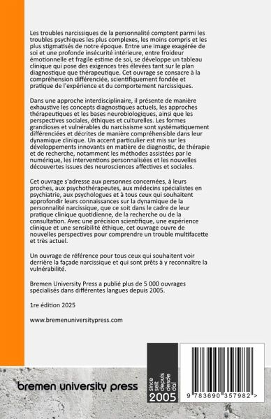 Les troubles narcissiques de la personnalité comptent parmi les troubles psychiques les plus complexes, les moins compris et les plus stigmatisés de notre époque. Entre une image exagérée de soi et une profonde insécurité intérieure, entre froideur émotionnelle et fragile estime de soi, se développe un tableau clinique qui pose des exigences très élevées tant sur le plan diagnostique que thérapeutique. Cet ouvrage se consacre à la compréhension différenciée, scientifiquement fondée et pratique de l'expérience et du comportement narcissiques. Dans une approche interdisciplinaire, il présente de manière exhaustive les concepts diagnostiques actuels, les approches thérapeutiques et les bases neurobiologiques, ainsi que les perspectives sociales, éthiques et culturelles. Les formes grandioses et vulnérables du narcissisme sont systématiquement différenciées et décrites de manière compréhensible dans leur dynamique clinique. Un accent particulier est mis sur les développements innovants en matière de diagnostic, de thérapie et de recherche, notamment les méthodes assistées par le numérique, les interventions personnalisées et les nouvelles découvertes issues des neurosciences affectives et sociales. Cet ouvrage s'adresse aux personnes concernées, à leurs proches, aux psychothérapeutes, aux médecins spécialistes en psychiatrie, aux psychologues et à tous ceux qui souhaitent approfondir leurs connaissances sur la dynamique de la personnalité narcissique, que ce soit dans le cadre de leur pratique clinique quotidienne, de la recherche ou de la consultation. Avec une précision scientifique, une expérience clinique et une sensibilité éthique, cet ouvrage ouvre de nouvelles perspectives pour comprendre un trouble multifacette et très actuel. Un ouvrage de référence pour tous ceux qui souhaitent voir derrière la façade narcissique et qui sont prêts à y reconnaître la vulnérabilité. Bremen University Press a publié plus de 5 000 ouvrages spécialisés dans différentes langues depuis 2005. 1re édition 2025