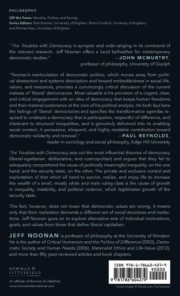 This book sets out the most influential theories of democracy (liberal-egalitarian, deliberative, and cosmopolitan) and argues that they fail to adequately comprehend the cause of politically meaningful inequality on the one hand and the security state on the other. The private and exclusive control of that which all need to survive, realize, and enjoy life, and their exploitation to increase the wealth of a small mostly white and male ruling class is the cause of both growing inequality and the instability and political violence that legitimates the growth of the security state. Jeff Noonan contends that the inequality and increasingly totalitarian practice of current systems of democracy proves that democratic ideals cannot be fully realized in existing institutions. These institutions are bound up with an economic system based upon private and exclusive control of the resources and wealth everyone needs in order to enjoy a meaningful life as socially self-conscious agents. However, this fact does not mean that democratic values are wrong, only that their realization demands a different set of social structures and institutions. Noonan goes on to explore alternative sets of individual motivations, goals, and values from those that define liberal-capitalism.