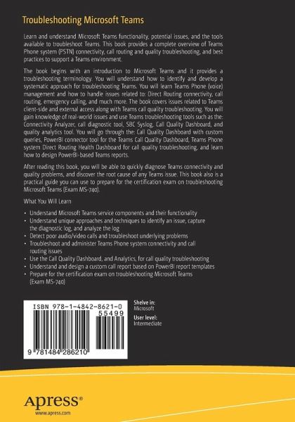 Learn and understand Microsoft Teams functionality, potential issues, and the tools available to troubleshoot Teams. This book provides a complete overview of Teams Phone system (PSTN) connectivity, call routing and quality troubleshooting, and best practices to support a Teams environment.