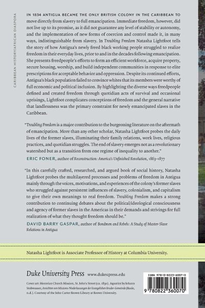 In 1834 Antigua became the only British colony in the Caribbean to move directly from slavery to full emancipation. Immediate freedom, however, did not live up to its promise, as it did not guarantee any level of stability or autonomy, and the implementation of new forms of coercion and control made it, in many ways, indistinguishable from slavery. In Troubling Freedom Natasha Lightfoot tells the story of how Antigua's newly freed black working people struggled to realize freedom in their everyday lives, prior to and in the decades following emancipation. She presents freedpeople's efforts to form an efficient workforce, acquire property, secure housing, worship, and build independent communities in response to elite prescriptions for acceptable behavior and oppression. Despite its continued efforts, Antigua's black population failed to convince whites that its members were worthy of full economic and political inclusion. By highlighting the diverse ways freedpeople defined and created freedom through quotidian acts of survival and occasional uprisings, Lightfoot complicates conceptions of freedom and the general narrative that landlessness was the primary constraint for newly emancipated slaves in the Caribbean.