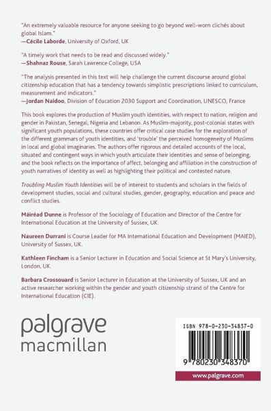 This book explores the production of Muslim youth identities, with respect to nation, religion and gender in Pakistan, Senegal, Nigeria and Lebanon. As Muslim-majority, post-colonial states with significant youth populations, these countries offer critical case studies for the exploration of the different grammars of youth identities, and 'trouble' the perceived homogeneity of Muslims in local and global imaginaries. The authors offer rigorous and detailed accounts of the local, situated and contingent ways in which youth articulate their identities and sense of belonging, and the book reflects on the importance of affect, belonging and affiliation in the construction of youth narratives of identity as well as highlighting their political and contested nature.
