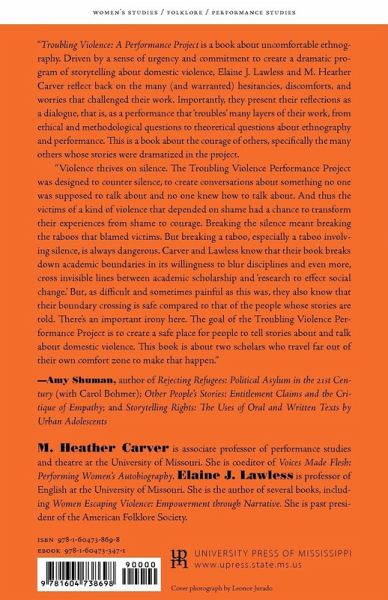 A study of a performing troupe in which women narrate the trauma of domestic violence Troubling Violence: A Performance Project follows the collaboration between performance studies professor M. Heather Carver and ethnographic folklorist Elaine J. Lawless. The book traces the creative development of a performance troupe in which women take the stage to narrate true, harrowing experiences of domestic violence and then invite audience members to discuss the tales. Similar to the performances, the book presents real-life narratives as a means of heightening social awareness and dialogue about intimate partner violence. "Troubling violence" refers not only to the cultures in our society that are "troubling," but also to the authors' intent to "trouble" perceptions that enforce social, cultural, legal, and religious attitudes that perpetuate abuse against women. Performance, this book argues, enhances ethnographic research and writing by allowing ethnographers to approach both their field studies and their ethnographic writing as performance. The book also demonstrates how ethnography enhances the study of performance. The authors discuss the development of the Troubling Violence Performance Project in conjunction with their own "performances" within the academy. M. Heather Carver is associate professor of performance studies and theatre at the University of Missouri. She is coeditor of Voices Made Flesh: Performing Women's Autobiography. Elaine J. Lawless is professor of English at the University of Missouri. She is the author of several books, including Women Escaping Violence: Empowerment through Narrative. She is president of the American Folklore Society.