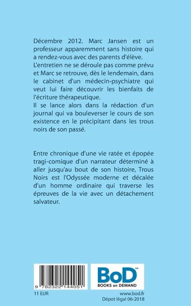 Entre chronique d'une vie ratée et épopée tragi-comique d'un narrateur déterminé à aller jusqu'au bout de son histoire, Trous Noirs est l'Odyssée moderne et décalée d'un homme ordinaire qui traverse les épreuves de la vie avec un détachement salvateur.