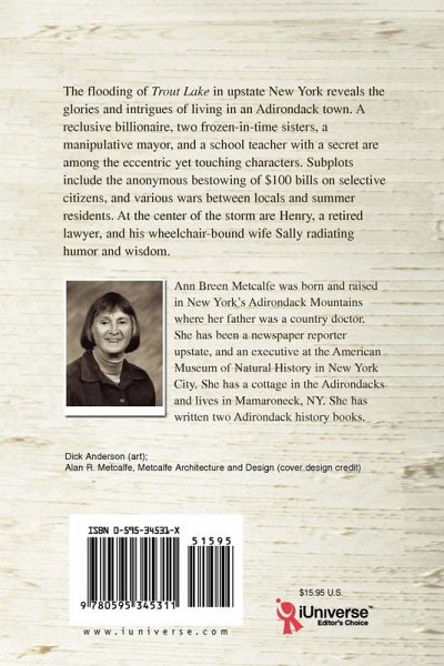 The flooding of Trout Lake in upstate New York reveals the glories and intrigues of living in an Adirondack town. A reclusive billionaire, two frozen-in-time sisters, a manipulative mayor, and a school teacher with a secret are among the eccentric yet touching characters. Subplots include the anonymous bestowing of $100 bills on selective citizens, and various wars between locals and summer residents. At the center of the storm are Henry, a retired lawyer, and his wheelchair-bound wife Sally radiating humor and wisdom.