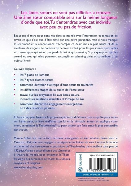 Les âmes soeurs ne sont pas difficiles à trouver. Une âme soeur compatible sera sur la même longueur d'onde que toi. Tu t'entendras avec cet individu avec peu ou pas de friction. Beaucoup d'entre nous sont nés dans ce monde avec l'impression et sensation de savoir ce que c'est que d'être aimé par une autre personne, mais il nous manque le sentiment et la connaissance d'accomplir ce désir dans la plus haute et de la meilleure des façons. Le contenu de ce livre est fait pour les personnes spirituelles et romantiques qui n'ont pas perdu la foi et qui savent qu'il y a quelqu'un qui les attend et avec qui elles pourront accomplir un planning divin et contribuer à un objectif élevé. Ce livre explore : - les 7 plans de l'amour - les 7 types d'âmes soeurs - comment identifier quel type d'âme soeur tu souhaites - les différentes étapes de la quête de l'âme soeur - travail sur les croyances lié aux âmes soeurs, incluant les relations sexuelles et l'image de soi - comment libérer ton engagement énergétique lié à des relations passées... Et beaucoup plus basé sur la propre expérience de Vianna dans sa quête pour trouver l'âme soeur, ce livre réaffirme ton foi en le véritable amour et explique comment, en utilisant le ThetaHealing, tu peux attirer ton âme soeur la plus compatible dans ta vie.