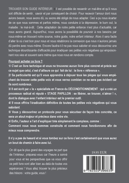 Comment trouver sa petite voix intérieure qui saura nous dire ce qui est BON POUR NOUS ? Encore allons nous devoir déjouer tous les pièges des anciens programmes qui ont été enregistrés. Et c'est là tous l'intérêt de ce livre qui est utilisé dans le PROCESSUS DE DÉCONDITIONNEMENT DU PAPILLON. C'est un livre technique !Pour trouver cette petite voix intérieure, nous devrons neutraliser les anciens programmes reflexes limitants. Alors si nous avons accès à notre guide, nous saurons et pourrons choisir, nous ne laisserons plus ce pouvoir à quiconque.Nous verrons aussi comment éradiquer ces petites voix négatives qui nous sabotent, nous réduisent, nous dévalorisent avec une efficacité redoutable.Par son approche concrète et pratique, il est devenu le livre référence sur le dialogue avec l'enfant intérieur. Il est écrit par Luc Pouget, spécialiste du déconditionnement et du décodage thérapeutique.