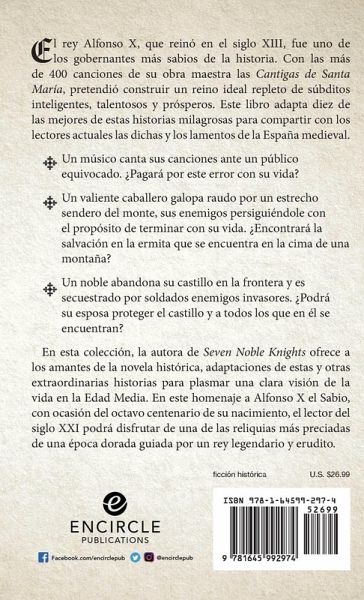 El rey Alfonso X, que reinó en el siglo XIII, fue uno de los gobernantes más sabios de la historia. Con las más de 400 canciones de su obra maestra las Cantigas de Santa María, pretendió construir un reino ideal repleto de súbditos inteligentes, talentosos y prósperos. Este libro adapta diez de las mejores de estas historias milagrosas para compartir con los lectores actuales las dichas y los lamentos de la España medieval.Un músico canta sus canciones ante un público equivocado. ¿Pagará por este error con su vida? Un valiente caballero galopa raudo por un estrecho sendero del monte, sus enemigos persiguiéndole con el propósito de terminar con su vida. ¿Encontrará la salvación en la ermita que se encuentra en la cima de una montaña? Un noble abandona su castillo en la frontera y es secuestrado por soldados enemigos invasores. ¿Podrá su esposa proteger el castillo y a todos los que en él se encuentran? En esta colección, la autora de Seven Noble Knights ofrece a los amantes de la novela histórica, adaptaciones de estas y otras extraordinarias historias para plasmar una clara visión de la vida en la Edad Media. En este homenaje a Alfonso X el Sabio, con ocasión del octavo centenario de su nacimiento, el lector del siglo XXI podrá disfrutar de una de las reliquias más preciadas de una época dorada guiada por un rey legendario y erudito.