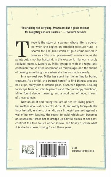 Gold-medal winner of the 2020 Nautilus Award, Gold-medal winner of the 2020 National Indie Excellence Award for Memoir, Featured on Moms Don't Have Time to Read Books "A stirring memoir that beautifully and humorously captures the pain of unresolved loss."- Kirkus Reviews The true story of a woman whose life is up-ended when she begins an armchair treasure hunt-a search for $10,000 worth of gold coins buried in New York City, of all places-with a man who, as she points out, is not her husband. In this eloquent, hilarious, sharply realized memoir, Sandra A. Miller grapples with the death of her difficult mother and the regret and confusion that so often accompanies middle age. In a very real way, Miller has spent her life hunting for buried treasure. As a child, she trained herself to find things: dropped hair clips, shiny bits of broken glass, discarded lighters. Looking to escape from her volatile parents and often-unhappy childhood, Miller found deeper meaning, and a good deal of hope, in each of these objects. Now an adult and facing the loss of her last living parent-her mother who is at once cold, difficult, and wildly funny-Miller finds herself, as she so often did as a little girl, pressed against a wall of her own longing. Her search for gold, which soon becomes an obsession, forces her to dredge up painful pieces of her past, confront the true source of her sorrow, and finally discover what it is she has been looking for all these years.