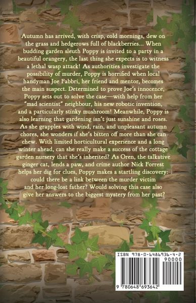 Autumn has arrived, with crisp, cold mornings, dew on the grass and hedgerows full of blackberries... When budding garden sleuth Poppy is invited to a party in a beautiful orangery, the last thing she expects is to witness a lethal wasp attack! As authorities investigate the possibility of murder, Poppy is horrified when local handyman Joe Fabbri, her friend and mentor, becomes the main suspect. Determined to prove Joe's innocence, Poppy sets out to solve the case - with help from her "mad scientist" neighbour, his new robotic invention, and a particularly stinky mushroom! Meanwhile, Poppy is also learning that gardening isn't just sunshine and roses. As she grapples with wind, rain, and unpleasant autumn chores, she wonders if she's bitten off more than she can chew. With limited horticultural experience and a long winter ahead, can she really make a success of the cottage garden nursery that she's inherited? As Oren, the talkative ginger cat, lends a paw, and crime author Nick Forrest helps her dig for clues, Poppy makes a startling discovery: could there be a link between the murder victim and her long-lost father? Would solving this case also give her answers to the biggest mystery from her past?
