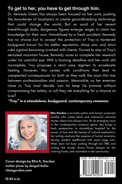 To get to her, you have to get through him. Dr. Kennedy Green has always been focused on her work, pushing the boundaries of biophysics to create groundbreaking technology that could change the world. But as word of her recent breakthrough leaks, dangerous figures emerge, eager to claim her knowledge for their own. Immobilized by a freak accident, Kennedy has no choice but to accept the protection of Troy-a hardened bodyguard known for his stellar reputation, sharp aim, and strict rules against becoming involved with clients. Forced to stay at Troy's secluded mountain house, Kennedy races to complete her research under his watchful eye. With a looming deadline and her work still incomplete, Troy proposes a strict care regimen to accelerate healing. However, this comes with conditions that lead to unexpected consequences for both as they walk the razor-thin line between professionalism and passion. Meanwhile, as her enemies close in, Troy must decide: can he keep his promise without compromising her safety, or will they risk everything for a chance at love? "Troy" is a standalone, bodyguard, contemporary romance.