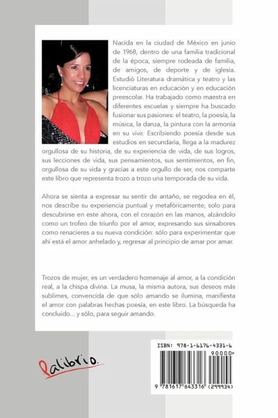 Trozos de mujer, es un verdadero homenaje al amor, a la condición real, a la chispa divina. La musa, la misma autora, sus deseos más sublimes, convencida de que sólo amando se ilumina, manifiesta el amor con palabras hechas poesía, en este libro. La búsqueda ha concluido... y sólo, para seguir amando.