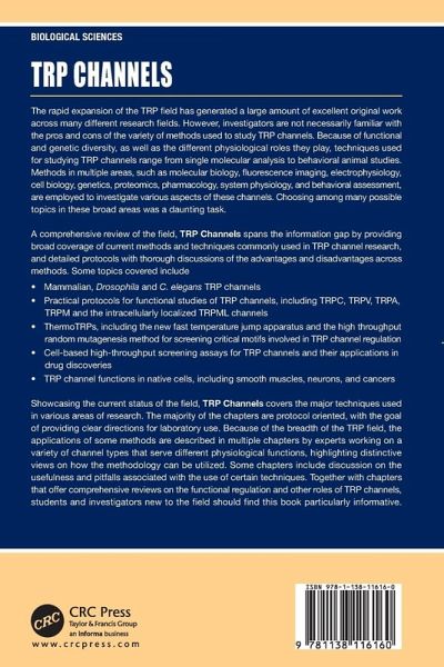 The rapid expansion of the TRP field has generated a large amount of excellent original work across many different research fields. However, investigators are not necessarily familiar with the pros and cons of the variety of methods used to study TRP channels. Because of functional and genetic diversity, as well as the different physiological roles they play, techniques used for studying TRP channels range from single molecular analysis to behavioral animal studies. Methods in multiple areas, such as molecular biology, fluorescence imaging, electrophysiology, cell biology, genetics, proteomics, pharmacology, system physiology, and behavioral assessment, are employed to investigate various aspects of these channels. Choosing among many possible topics in these broad areas was a daunting task. A comprehensive review of the field, TRP Channels spans the information gap by providing broad coverage of current methods and techniques commonly used in TRP channel research, and detailed protocols with thorough discussions of the advantages and disadvantages across methods. Some topics covered include Mammalian, Drosophila and C. elegans TRP channels Practical protocols for functional studies of TRP channels, including TRPC, TRPV, TRPA, TRPM and the intracellularly localized TRPML channels ThermoTRPs, including the new fast temperature jump apparatus and the high throughput random mutagenesis method for screening critical motifs involved in TRP channel regulation Cell-based high-throughput screening assays for TRP channels and their applications in drug discoveries TRP channel functions in native cells, including smooth muscles, neurons, and cancers Showcasing the current status of the field, TRP Channels covers the major techniques used in various areas of research. The majority of the chapters are protocol oriented, with the goal of providing clear directions for laboratory use. Because of the breadth of the TRP field, the applications of some methods are described in multiple chapters by experts working on a variety of channel types that serve different physiological functions, highlighting distinctive views on how the methodology can be utilized. Some chapters include discussion on the usefulness and pitfalls associated with the use of certain techniques. Together with chapters that offer comprehensive reviews on the functional regulation and other roles of TRP channels, students and investigators new to the field should find this book particularly informative.