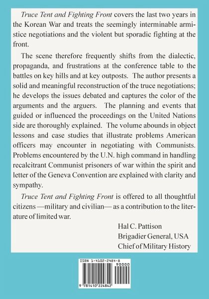 Truce Tent and Fighting Front covers the last two years in the Korean War and treats the seemingly interminable armistice negotiations and the violent but sporadic fighting at the front. The scene therefore frequently shifts from the dialectic, propaganda, and frustrations at the conference table to the battles on key hills and at key outposts. The author presents a solid and meaningful reconstruction of the truce negotiations; he develops the issues debated and captures the color of the arguments and the arguers. The planning and events that guided or influenced the proceedings on the United Nations side are thoroughly explained. The volume abounds in object lessons and case studies that illustrate problems American officers may encounter in negotiating with Communists. Problems encountered by the U.N. high command in handling recalcitrant Communist prisoners of war within the spirit and letter of the Geneva Convention are explained with clarity and sympathy. Truce Tent and Fighting Front is offered to all thoughtful citizens ---military and civilian--- as a contribution to the literature of limited war. Hal C. Pattison Brigadier General, USA Chief of Military History
