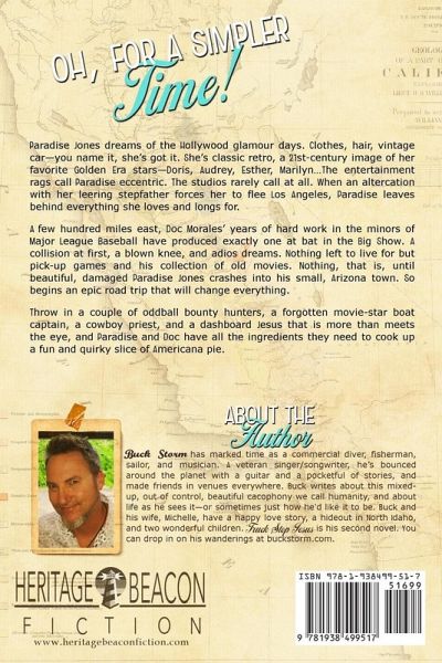Oh, for a simpler time! Paradise Jones dreams of the Hollywood glamour days. Clothes, hair, vintage car--you name it, she's got it. She's classic retro, a 21st-century image of her favorite Golden Era stars--Doris, Audrey, Esther, Marilyn. The entertainment rags call Paradise eccentric. The studios rarely call at all. When an altercation with her leering stepfather forces her to flee Los Angeles, Paradise leaves behind everything she loves and longs for. A few hundred miles east, Doc Morales' years of hard work in the minors of Major League Baseball have produced exactly one at bat in the Big Show. A collision at first, a blown knee, and adios dreams. Nothing left to live for but pick-up games and his collection of old movies. Nothing, that is, until beautiful, damaged Paradise Jones crashes into his small, Arizona town. So begins an epic road trip that will change everything. Throw in a couple of oddball bounty hunters, a forgotten movie-star boat captain, a cowboy priest, and a dashboard Jesus that is more than meets the eye, and Paradise and Doc have all the ingredients they need to cook up a fun and quirky slice of Americana pie.