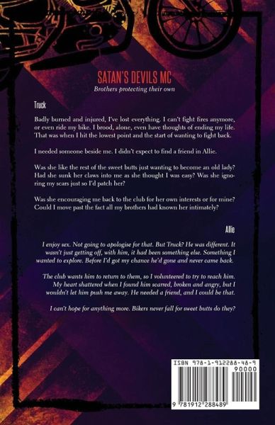 Truck Badly burned and injured I've lost everything. I can't fight fires anymore, or even ride my bike. I brood, alone. I even have thoughts of ending my life. What have I got to live for? That was when I hit my lowest point and began to want to fight back. I couldn't do it alone, but never expected the person who'd be a friend to me would be Allie. Was she like the rest of the sweet butts willing to do anything to become a biker's old lady? Had she sunk her claws into me because she thought I was easy? Was she ignoring my scars just so I'd patch her? Was she encouraging me back to the club for her interests or for mine? Could I move past the fact all my brothers had known her intimately? Allie I enjoy sex. I'm not going to apologise for that. But Truck? He was different. It wasn't just getting off with him, it had been something else. Something I wanted to explore. Before I got my chance he'd gone, and hadn't returned, or at least, not as the man he once was. The club wants him back, so I volunteered to try to reach him. My heart shattered when I found him scarred, broken and angry, but I wouldn't let him push me away. He needed a friend and I could be that. I can't hope for anything more. Biker's never fall for sweet butts, do they?