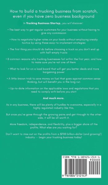 How to build a trucking business from scratch, even if you have zero business background With the surge of online shopping all over the world, the logistics and warehousing industries are more in demand than ever. Trucking is an essential part of this supply chain, accounting for over 70% of all freight transported in the United States and worth over $700 billion. Do you want to get a piece of this incredibly gigantic pie, even if you don't have hundreds of dollars to invest? Actually, you can. Starting your own trucking company doesn't have to be something reserved for major corporations with bottomless wallets. Even an ordinary individual like you can start a trucking business in just 30 days with some guts, determination, creative thinking, and the help of this straightforward guide to starting your own trucking company. In Trucking Business Startup 2021, you will discover: The best way to get regular customers for your business without having to give any commission How to negotiate higher rates on your loads without employing sneaky tactics by using these easy-to-implement strategies The first thing you should do before choosing a truck so you don't end up with half-empty trucks 8 common reasons why trucking businesses fail within the first year, and how to make sure you're not one of them What to look for on a load board that will get you better deals and more bargaining power A little-known trick to save money on fuel that goes against common sense thinking, but will benefit you in the long run Up-to-date information on the applicable laws and regulations that you need to comply with before you start If you don't want to miss out on the profits from a $700 billion-dollar (and growing!) industry, then scroll up and click the "Add to Cart" button right now.