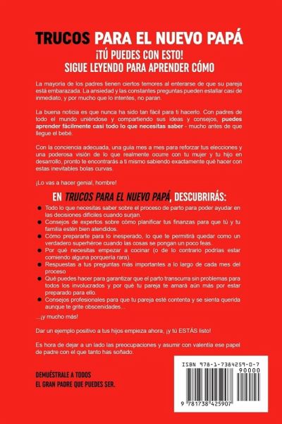 ¿Tu pareja acaba de darte una sacudida con la gran "palabra con la E" y ahora te das cuenta de repente de que no tienes ni idea de lo que se supone que debes hacer al respecto? ¿Estás emocionado y aterrorizado al mismo tiempo y realmente pensabas que estarías más preparado para esto de lo que te sientes actualmente? Quizá sea algo inesperado, o quizá lleves tiempo intentándolo, pero de repente es verdad: ¡vas a ser papá! Independientemente de cómo te sientas actualmente, una cosa es segura: tu vida está a punto de cambiar para siempre. Pero esto no tiene por qué ser abrumador ni descarrilarte. No tienes que pasar apuros durante los próximos meses y acabar aprendiendo todas las lecciones por las malas. En realidad, ¡puedes hacer exactamente lo contrario! Esto es normal, y está totalmente bien sentir que no estás preparado. Sin embargo, depende de ti garantizar que, antes de que llegue el momento, estés realmente preparado. La buena noticia es que nunca ha sido tan fácil para ti hacerlo. Con padres de todo el mundo uniéndose y compartiendo sus ideas y consejos, puedes aprender fácilmente casi todo lo que necesitas saber - mucho antes de que llegue el bebé. Con la conciencia adecuada, una guía mes a mes para reforzar tus elecciones y una poderosa visión de lo que realmente ocurre con tu mujer y tu hijo en desarrollo, pronto te encontrarás a ti mismo sabiendo exactamente qué hacer con estas inevitables bolas curvas. ¡Lo vas a hacer genial, hombre! En Trucos para el Nuevo Papá tú descubrirás:Todo lo que necesitas saber sobre el proceso de parto para poder ayudar en las decisiones difíciles cuando surjan. Consejos de expertos sobre cómo planificar tus finanzas para que tú y tu familia estén bien atendidos. Cómo prepararte para lo inesperado, lo que te permitirá quedar como un verdadero superhéroe cuando las cosas se pongan un poco feas. Por qué necesitas empezar a cocinar (o de lo contrario podrías estar comiendo alguna porquería rara). Respuestas a tus preguntas más importantes a lo largo de cada mes del proceso Qué puedes hacer para garantizar que el parto transcurra sin problemas para todos los involucrados y por qué tu pareja te amará aún más por estar preparado para ello. Consejos profesionales para que tu pareja esté contenta y se sienta querida aunque te grite obscenidades... ...¡y mucho más! Mira amigo, esto es algo grande - tienes toda la razón. Pero tú puedes manejarlo. Puedes dominarlo y desarrollar las habilidades que necesitarás para estar ahí para tu familia. Dar un ejemplo positivo a tus hijos empieza ahora, ¡y tú ESTÁS listo! Es hora de dejar a un lado las preocupaciones y asumir con valentía ese papel de padre con el que tanto has soñado.