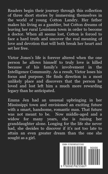 Readers begin their journey through this collection of three short stories by immersing themselves in the world of eighteen-year-old Cotton Landry. Her loving father makes his living as a gambler, but Cotton dreams of becoming a doctor. She fears she's destined for a career at Guidry's Handi-mart and Bait Shop unless she can permanently leave her rural Louisiana hometown. When all seems lost, Cotton is forced to face the truth and uncover the real meaning of love and devotion that will both break her heart and set her free. Trained from a young age to work as an assassin, Victor Jones believes in his duty to eliminate targets in order to protect the safety of others in the world. His life is forever altered when the one person he allows himself to truly love is killed because of his family's involvement in the Intelligence Community. As a result, Victor loses his focus and purpose. He finds direction in a most unlikely place and discovers that the person he loved and lost left him a much more rewarding legacy. Emma Jen had an unusual upbringing in her Mississippi town and envisioned an exciting future with a smart, handsome, romantic man. However, that future was not to be. Now middle-aged and a widow for many years, she is raising her granddaughter alone. Longing for the life she never had, she decides to discover if it's not too late to attain the dream that she sought as a girl. Emma Jen journeys toward fulfilling her potential and uncovers new possibilities without losing sight of her renewed hope.