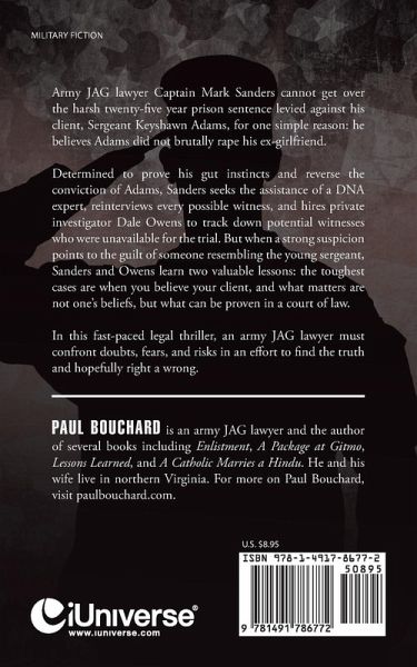 Army JAG lawyer Captain Mark Sanders cannot get over the harsh twenty-five year prison sentence levied against his client, Sergeant Keyshawn Adams, for one simple reason: he believes Adams did not brutally rape his ex-girlfriend. Determined to prove his gut instincts and reverse the conviction of Adams, Sanders seeks the assistance of a DNA expert, reinterviews every possible witness, and hires private investigator Dale Owens to track down potential witnesses who were unavailable for the trial. But when a strong suspicion points to the guilt of someone resembling the young sergeant, Sanders and Owens learn two valuable lessons: the toughest cases are when you believe your client, and what matters are not one's beliefs, but what can be proven in a court of law. In this fast-paced legal thriller, an army JAG lawyer must confront doubts, fears, and risks in an effort to find the truth and hopefully right a wrong.