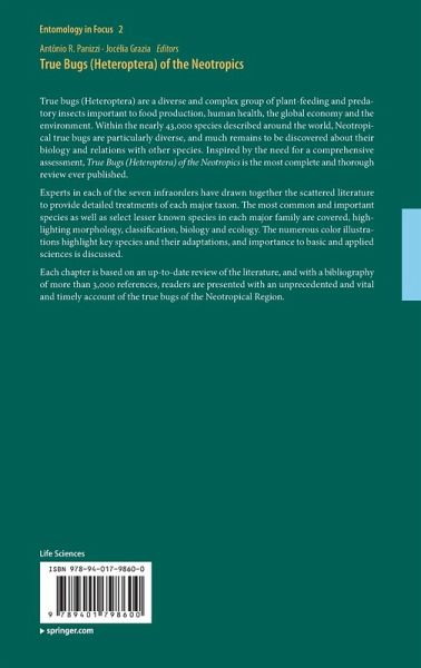 True bugs (Heteroptera) are a diverse and complex group of plant-feeding and predatory insects important to food production, human health, the global economy and the environment. Within the nearly 43,000 species described around the world, Neotropical true bugs are particularly diverse, and much remains to be discovered about their biology and relations with other species. Inspired by the need for a comprehensive assessment, True Bugs (Heteroptera) of the Neotropics is the most complete and thorough review ever published.