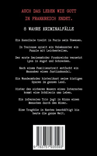 Auch das Leben wie Gott in Frankreich endet.Manchmal zu schnell, oft auf grausame Art und Weise und mitunter aus den verblüffendsten Gründen. Ein Kannibale treibt in Paris sein Unwesen. In Toulouse spielt ein Unbekannter ein Puzzle mit Leichenteilen. Der erste Serienmörder Frankreichs versetzt Lyon in Angst und Schrecken.Nach einem Familienstreit entfacht ein Massaker einen Justizskandal.Ein Wandermörder hinter-lässt seine blutigen Spuren im ganzen Land.Hinter den sicheren Mauern eines Internates kommt eine Schülerin auf tragische Weise ums Leben.Ein infernales Trio jagt in Nizza einen Menschen durch den Mixer. Eine Tragödie in Nizza beschäftigt bis heute die ganze Welt.Im ersten Band von True Crime: Frankreich stellt Eva-Maria Hartmann in intensiver Sprache und realitätsnaher Form 8 wahre Kriminalfälle aus Frankreich vor.