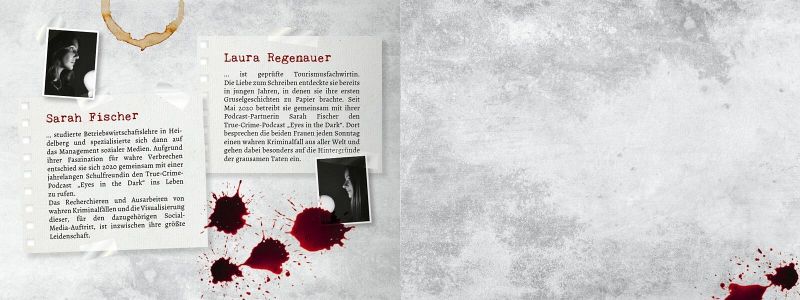 Laura Regenauer ist geprüfte Tourismusfachwirtin. Die Liebe zum Schreiben entdeckte sie bereits in jungen Jahren, in denen sie ihre ersten Gruselgeschichten zu Papier brachte. Seit Mai 2020 betreibt sie gemeinsam mit ihrer Podcast-Partnerin Sarah Fischer den True Crime Podcast "Eyes in the Dark". Dort besprechen die beiden Frauen jeden Sonntag einen wahren Kriminalfall aus aller Welt und gehen dabei besonders auf die Hintergründe der grausamen Taten ein. Sarah Fischer studierte Betriebswirtschaftslehre in Heidelberg und spezialisierte sich dann auf das Management sozialer Medien. Aufgrund ihrer Faszination für wahre Verbrechen entschied sie sich 2020 gemeinsam mit einer jahrelangen Schulfreundin den True Crime Podcast "Eyes in the Dark" ins Leben zu rufen. Das Recherchieren und Ausarbeiten von wahren Kriminalfällen und die Visualisierung dieser, für den dazugehörigen Social-Media-Auftritt, ist inzwischen ihre größte Leidenschaft.