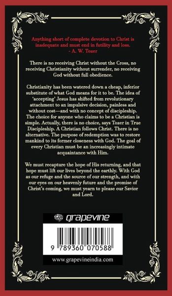 Anything short of complete devotion to Christ is inadequate and must end in futility and loss. - A. W. Tozer There is no receiving Christ without the Cross, no receiving Christianity without surrender, no receiving God without full obedience. Christianity has been watered down a cheap, inferior substitute of what God means for it to be. The idea of 'accepting' Jesus has shifted from revolutionary attachment to an impulsive decision, painless and without cost-and with no concept of discipleship. The choice for anyone who claims to be a Christian is simple. Actually, there is no choice, says Tozer in True Discipleship. A Christian follows Christ. There is no alternative. The purpose of redemption was to restore mankind to its former closeness with God. The goal of every Christian must be an increasingly intimate acquaintance with Him. We must recapture the hope of His returning, and that hope must lift our lives beyond the earthly. With God as our refuge and the source of our strength, and with our eyes on our heavenly future and the promise of Christ's coming, we must yearn to please our Savior and Lord.