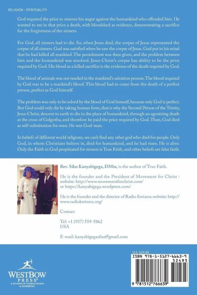 God required the price to remove his anger against the humankind who offended him. He wanted to see in that price a death, with bloodshed as evidence, demonstrating a sacrifice for the forgiveness of the sinners. For God, all sinners had to die. So, when Jesus died, the corpse of Jesus represented the corpse of all sinners. God was satisfied when he saw the corpse of Jesus. God put in his mind that he had killed all mankind. The punishment was then given, and the problem between him and the humankind was resolved. Jesus Christ’s corpse has ability to be the price required by God. His blood as a killed sacrifice is the evidence of the death required by God. The blood of animals was not needed in the mankind’s salvation process. The blood required by God was to be a mankind’s blood. This blood had to come from the death of a perfect person, perfect as God himself. The problem was only to be solved by the blood of God himself, because only God is perfect. But God could only die by taking human form, that is why the Second Person of the Trinity, Jesus Christ, descent to earth to die in the place of humankind, through an agonizing death at the cross of Golgotha, and therefore he paid the price required by God. Then, God died as self-substitution for men. He was God-man. In beliefs of different world religions, we can’t find any other god who died for people. Only God, in whom Christians believe in, died for humankind, and he had risen. He is alive. Only the Faith in God propitiated for sinners is True Faith, and other beliefs are false faith.