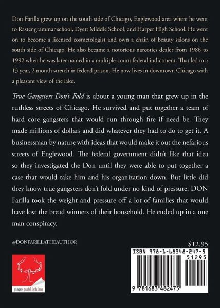 True Gangsters Don't Fold is about a young man that grew up in the ruthless streets of Chicago. He survived and put together a team of hard core gangsters that would run through fire if need be. They made millions of dollars and did whatever they had to do to get it. A businessman by nature with ideas that would make it out the nefarious streets of Englewood. The federal government didn't like that idea so they investigated the Don until they were able to put together a case that would take him and his organization down. But little did they know true gangsters don't fold under no kind of pressure. DON Farilla took the weight and pressure off a lot of families that would have lost the bread winners of their household. He ended up in a one man conspiracy.