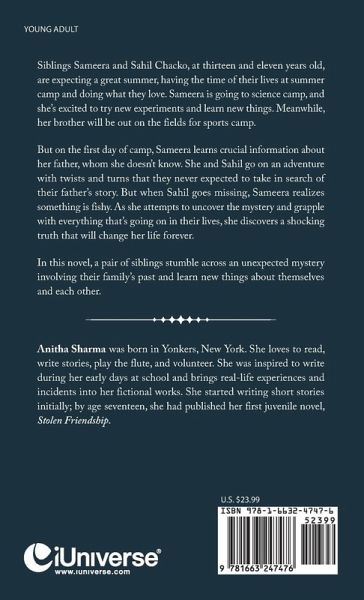 Siblings Sameera and Sahil Chacko, at thirteen and eleven years old, are expecting a great summer, having the time of their lives at the summer camp and doing what they love. Sameera is going to science camp, and she's excited to try new experiments and learn new things. Meanwhile, her brother will be out on the fields for sports camp. But on the first day of camp, Sameera learns crucial information about her father, whom she doesn't know. She and Sahil go on an adventure with twists and turns that they never expected to take in search of their father's story. But when Sahil goes missing, Sameera realizes something is fishy. As she attempts to uncover the mystery and grapple with everything that's going on in their life, she discovers a shocking truth that will change her life forever. In this novel, a pair of siblings stumble across an unexpected mystery involving their family's past and learn new things about themselves and each other.