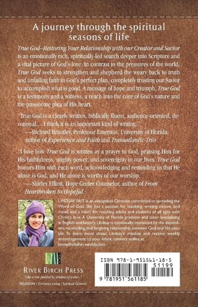 A journey through the spiritual seasons of life True God-Restoring Your Relationship with our Creator and Savior is an emotionally rich, spiritually-led search deeper into Scripture and a vital picture of God's love. In contrast to the pressures of the world, True God seeks to strengthen and shepherd the weary back to truth and unfailing faith in God's perfect plan, completely trusting our Savior to accomplish what is good. A message of hope and triumph, True God is a testimony and a witness, a reach into the core of God's nature and the passionate plea of His heart.