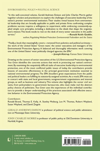 Preface Lee M. Thomas Introduction Chapter 1: Call and Response: The Senior Executive Service Thomas Kelly Chapter 2: Managing the Conventional Path: Air Quality Planning and Management Gerald Andrews Emison Chapter 3: The Challenges of Pesticide Regulation: Reconciling Past Decisions While Forging a Better Future Susan Wayland Chapter 4: Leading at the Intergovernmental Boundary: EPA's Regional Offices A. Stanley Meiburg Chapter 5: Transitioning from the Conventional Path: Water Quality and Wetlands/Watersheds Robert Wayland Chapter 6: Protection Without Command-And-Control Systems: The Underground Storage Tanks System Ronald Brand Chapter 7: Protection in a Non-Regulated World: The Indoor Air Program Thomas Kelly Chapter 8: Formal systems for Planning and Managing National Environmental Protection David Ziegele Chapter 9: Lessons for Leadership in Environmental Management John C. Morris and Gerald Andrews Emison