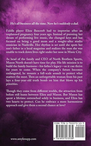 He's all business all the time. Now he's suddenly a dad. Fiddle player Eliza Bancroft had to improvise after an unplanned pregnancy four years ago. Instead of pursuing her dream of performing live music, she changed keys and has focused on being a good mom and a sought-after studio musician in Nashville. Her rhythm is set until she spots her son's father in a local magazine and realizes the man she was unable to track down lives right under her nose in Music City. As head of the family and CEO of North Brothers Sports, Mason North doesn't have time for play. His life mission is to build the family business-his father's legacy-so it can thrive for years to come. When the company's future becomes endangered, he mounts a full-scale assault to protect what matters the most. Then an unforgettable woman from his past lays a four-year-old truth bomb on him that blows up his priorities. Though they come from different worlds, the attraction from before still hums between Eliza and Mason. But Mason has spent a lifetime entrenched solely in business, and Eliza has two hearts to protect. Can he embrace a more harmonious approach and give them a second chance at love?