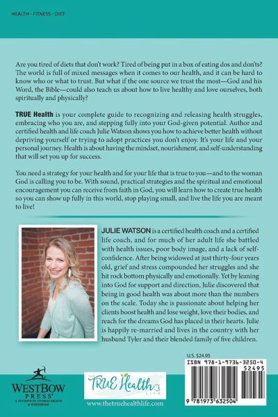 Are you tired of diets that dont work? Tired of being put in a box of eating dos and donts? The world is full of mixed messages when it comes to our health, and it can be hard to know who or what to trust. But what if the one source we trust the mostGod and his Word, the Biblecould also teach us about how to live healthy and love ourselves, both spiritually and physically? TRUE Health is your complete guide to recognizing and releasing health struggles, embracing who you are, and stepping fully into your God-given potential. Author and certified health and life coach Julie Watson shows you how to achieve better health without depriving yourself or trying to adopt practices you dont enjoy. Its your life and your personal journey. Health is about having the mindset, nourishment, and self-understanding that will set you up for success. You need a strategy for your health and for your life that is true to youand to the woman God is calling you to be. With sound, practical strategies and the spiritual and emotional encouragement you can receive from faith in God, you will learn how to create true health so you can show up fully in this world, stop playing small, and live the life you are meant to live!