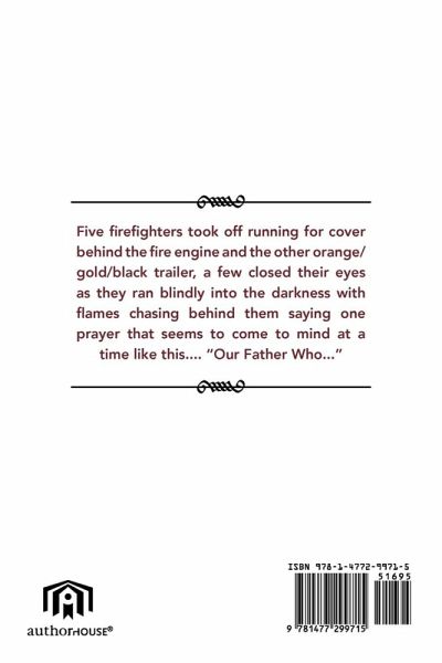 Five firefighters took off running for cover behind the fire engine and the other gold/black trailer, a few closed their eyes as they ran blindly into the darkness with flames chasing behind them saying one prayer that seems to come to mind at a time like this.... "Our Father Who..."