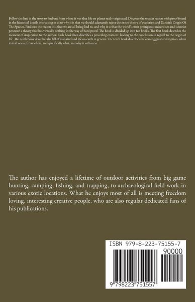 Follow the line in the story to find out from where it was that life on planet really originated. Discover the secular reason with proof found in the historical details instructing us as to why it is that we should adamantly reject the entire theory of evolution and Darwin's Origin Of The Species. Find out the reason it is that we are all being lied to, and why it is that the world's most prestigious universities and scientist promote a theory that has virtually nothing in the way of hard proof. The book is divided up into ten books. The first book describes the moment of inspiration to the author. Each book then describes a preceding moment, leading to the conclusion in regard to the origin of life. The ninth book describes the fall of mankind and life on earth in general. The tenth book describes the coming great redemption, when it shall occur, from where, and specifically what, and why it will occur.