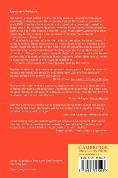 Jonathan Falla, a nurse and prizewinning playwright, spent an illegal year living with the Karen rebels. His richly illustrated account of life in the Burmese jungle creates an evocative portrait of a people fighting to preserve their way of life. The Karen, one of Burma's many minority peoples, have been waging an increasingly desperate war for autonomy against the Burmese government since 1949. Burma's 'closed door' policies have prevented any close study of Karen society since the 1920s and more recent writers have been forced to concentrate on Karen refugee communities in Thailand. Discussing all aspects of Karen life, this is no ordinary anthropological study but a highly personalized account. Based on the lives of individual Karen there are chapters on music, food, love, the patterns of forest and river life, on women, language, weaponry and mercenaries, and on the symbols of rebel nationalism.