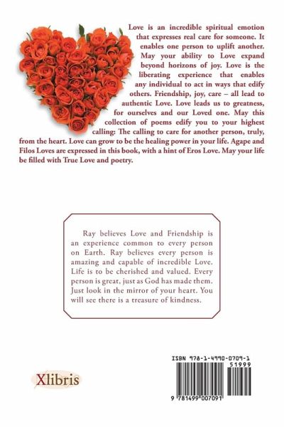 Love is an incredible spiritual emotion that expresses real care for someone. It enables one person to uplift another. May your ability to Love expand beyond horizons of joy. Love is the liberating experience that enables any individual to act in ways that edify others. Friendship, joy, care-all lead to authentic Love. Love leads us to greatness, for ourselves and our Loved one. May this collection of poems edify you to your highest calling: The calling to care for another person, truly, from the heart. Love can grow to be the healing power in your life. Agape and Filos Loves are expressed in this book, with a hint of Eros Love. May your life be filled with True Love and poetry.