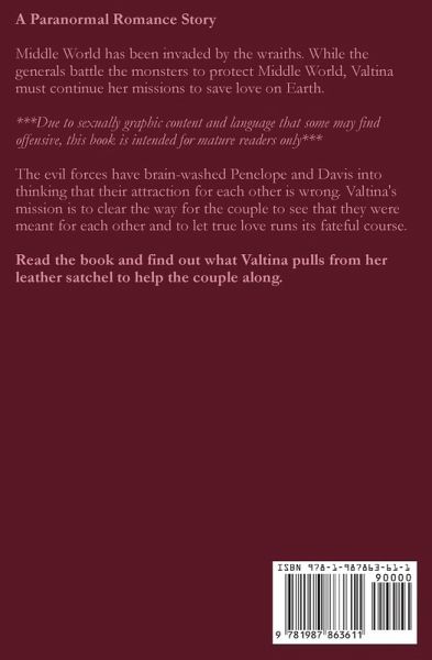 A Paranormal Romance Story Middle World has been invaded by the wraiths. While the generals battle the monsters to protect Middle World, Valtina must continue her missions to save love on Earth. ***Due to sexually graphic content and language that some may find offensive, this book is intended for mature readers only*** The evil forces have brain-washed Penelope and Davis into thinking that their attraction for each other is wrong. Valtina's mission is to clear the way for the couple to see that they were meant for each other and to let true love runs its fateful course. Read the book and find out what Valtina pulls from her leather satchel to help the couple along.