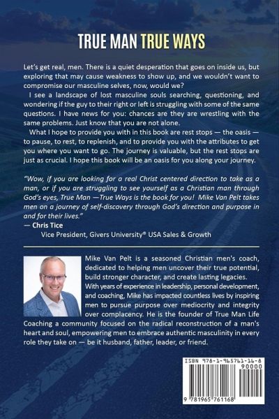Let's get real, men. There is a quiet desperation that goes on inside us, but exploring that may cause weakness to show up, and we wouldn't want to compromise our masculine selves, now, would we?I see a landscape of lost masculine souls searching, questioning, and wondering if the guy to their right or left is struggling with some of the same questions. I have news for you: chances are they are wrestling with the same problems. Just know that you are not alone. What I hope to provide you with in this book are rest stops - the oasis - to pause, to rest, to replenish, and to provide you with the attributes to get you where you want to go. The journey is valuable, but the rest stops are just as crucial. I hope this book will be an oasis for you along your journey.True Man True Ways is your guide to discovery of yourself and a roadmap to success. This book is focused on the radical reconstruction of a man's heart and soul, empowering men to embrace authentic masculinity in every role they take on - be it husband, father, leader, or friend.