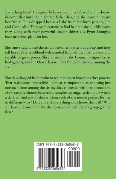 Everything North Campbell believes about her life is a lie. She doesn't discover that until the night her father dies, and she learns he wasn't her father. He kidnapped her as a baby from her birth parents, Jim and Carol Allis. They seem ecstatic to find her, but she quickly learns they, along with their powerful dragon-shifter ally Pytor Douglas, have nefarious plans for her. She runs straight into the arms of another mysterious group, and they tell her she's a Trueblood—descended from all the mythic races and capable of great power. She's at risk, but the Council assigns her six bodyguards, and the Oracle has seen her future husband is among the six. North is dragged from realm to realm to learn how to use her powers. That task seems impossible—almost as impossible as choosing just one man from among the six mythics entrusted with her protection. How can she choose between a vampire, an angel, a demon, a witch, a dark elf, and a wolf-shifter when each of the men is perfect for her in different ways? Dare she risk everything and choose them all? Will she have a chance to make the decision, or will Pytor's group get her first? This is part-five of a seven-part, completed serial.