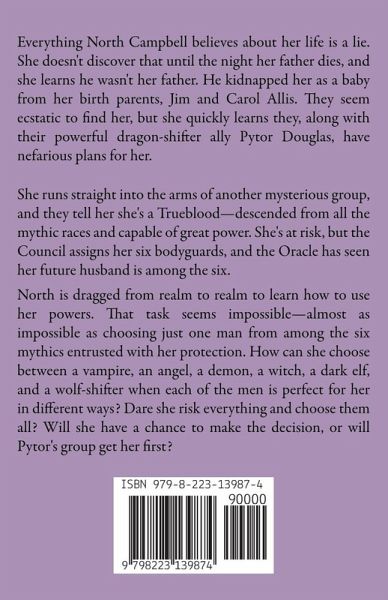 Everything North Campbell believes about her life is a lie. She doesn't discover that until the night her father dies, and she learns he wasn't her father. He kidnapped her as a baby from her birth parents, Jim and Carol Allis. They seem ecstatic to find her, but she quickly learns they, along with their powerful dragon-shifter ally Pytor Douglas, have nefarious plans for her. She runs straight into the arms of another mysterious group, and they tell her she's a Trueblood-descended from all the mythic races and capable of great power. She's at risk, but the Council assigns her six bodyguards, and the Oracle has seen her future husband is among the six. North is dragged from realm to realm to learn how to use her powers. That task seems impossible-almost as impossible as choosing just one man from among the six mythics entrusted with her protection. How can she choose between a vampire, an angel, a demon, a witch, a dark elf, and a wolf-shifter when each of the men is perfect for her in different ways? Dare she risk everything and choose them all? Will she have a chance to make the decision, or will Pytor's group get her first? This is the seventh and final part of the seven-part, completed serial.